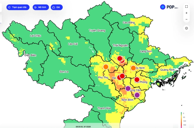 Bản đồ ô nhiễm không khí ở miền Bắc,sáng 9/1. Ảnh: VietnamAir