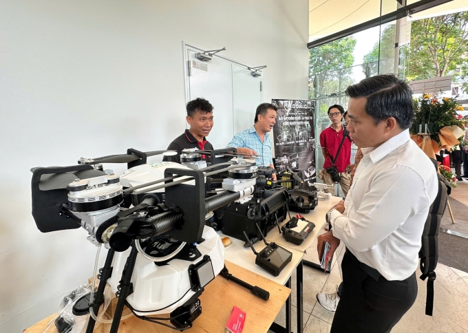 Khách tham dự tìm hiểu thiết bị bay không người lái phục vụ công nghiệp tại lễ ra mắt Sàn giao dịch công nghệ TP HCM,sáng 20/3. Ảnh: Lê Tuyết
