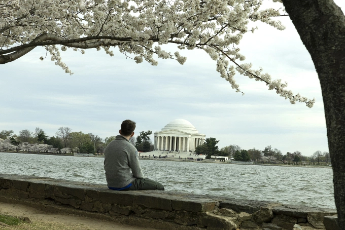 Người đàn ông ngồi ngắm cảnh dưới dãy hoa anh đào nở rộ dọc hồ Tidal Basin,gần Đài tưởng niệm Jefferson ở thủ đô Washington ngày 25/3. Ảnh: AFP