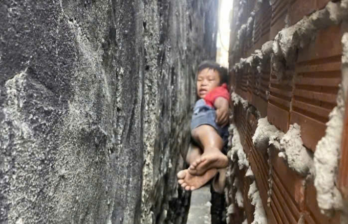 Bé trai 9 tuổi mắc kẹt giữa hai bức tường khi trèo mái nhà cao 4 m bắt mèo, được cảnh sát giải cứu sau hơn 20 phút, trưa 25/3.